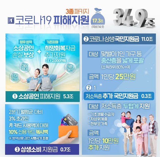 이번 5차 재난지원금은 3종 패키지로 구성됩니다. 소득하위 88%를 대상으로 1인당 25만원을 지급하는 코로나 상생국민지원금과 전국민 대상 10% 카드캐시백 상생소비지원금 그리고 소상공인 회복자금은 피해규모에 따라 최대 2000만원까지 지급됩니다.